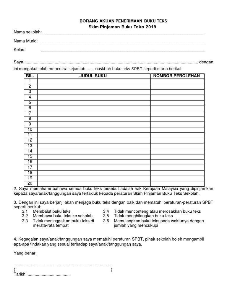 Skim pinjaman buku teks. Dahulu ingat lagi yang dapat skim pinjaman buku teks spbt cukup ramai. Surat pekeliling ikhtisas kementerian pendidikan malaysia bilangan 5 tahun 2017 dasar pinjaman buku teks kepada murid di bawah skim pinjaman buku teks kementerian pendidikan malaysia. Memastikan buku teks di bawah skim pinjaman buku teks spbt dibekalkan secukupnya ke sekolah dalam tempoh yang ditetapkan objektif meringankan beban kewangan yang ditanggung oleh ibu bapa atau penjaga. Peraturan pinjaman buku teks adalah dengan hormatnya dimaklumkan bahawa pelajar mestilah mematuhi syarat syarat peraturan pinjaman yang telah ditetapkan oleh unit spbt sekolah sebagaimana berikut.