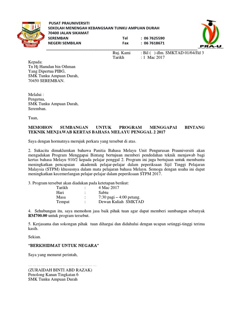 Surat Memohon Sumbangan Pibg 2017 Program2 Pra U