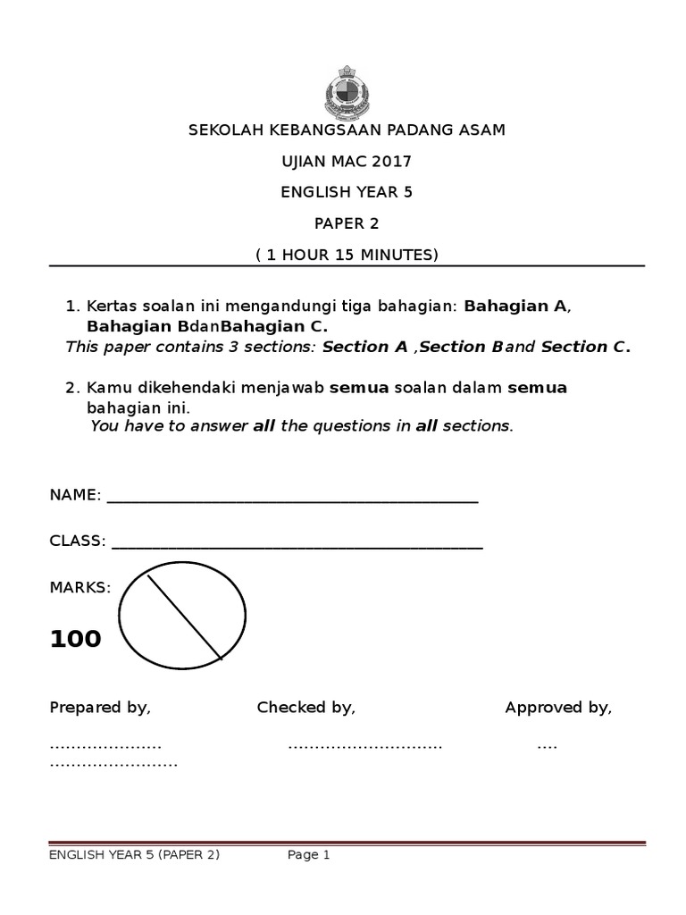 Soalan Bahasa Inggeris Tahun 5 Ujian 1 Bulan Mac 2017