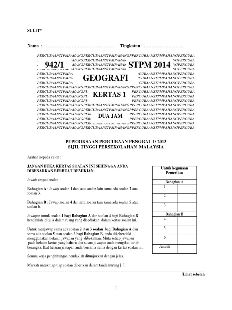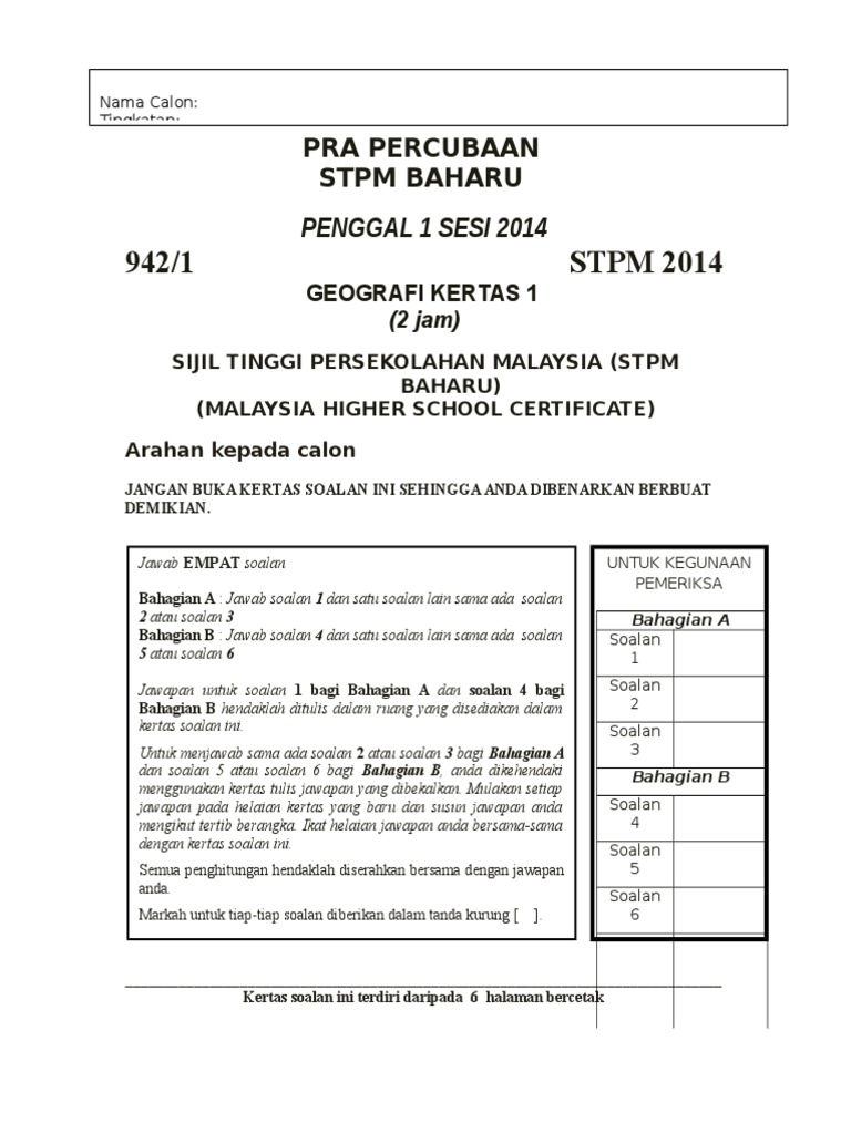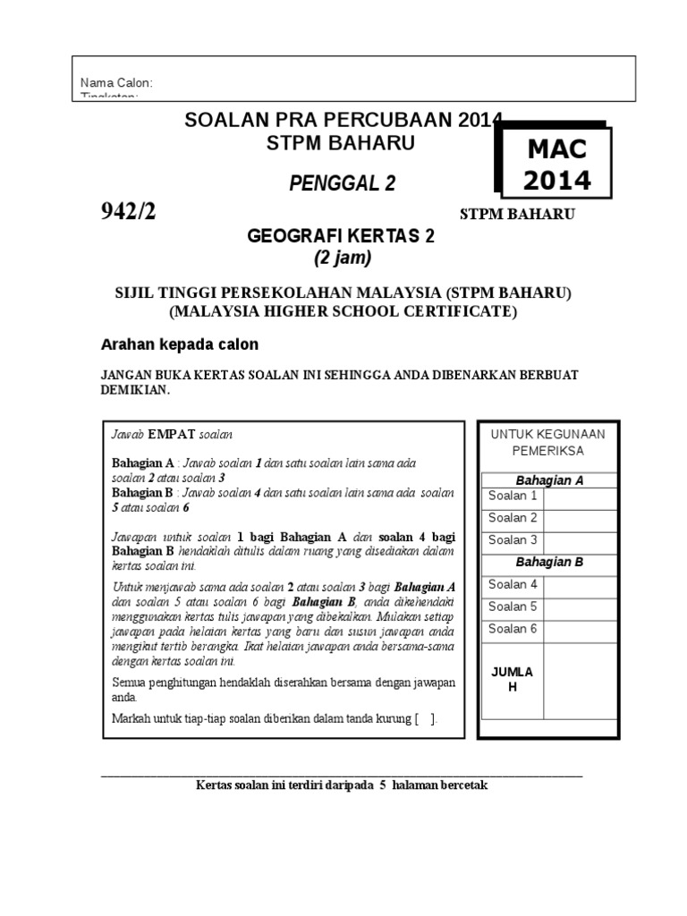 Geografi Stpm Soalan Peperiksaan Percubaan Penggal 1 2016