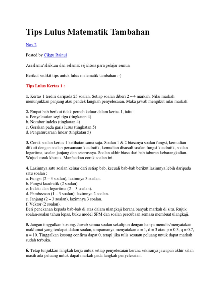 Tips Lulus Matematik Tambahan