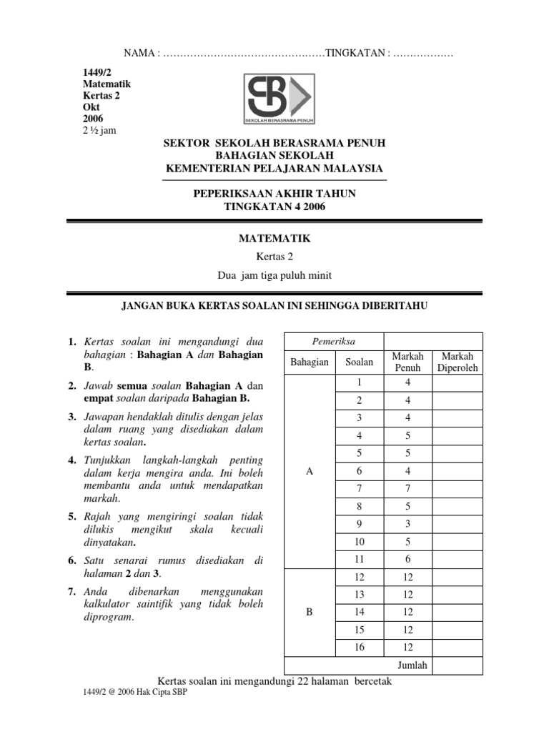 Nota ringkas soalan skema jawapan. Matematik mathematics spm. Soalan peperiksaan akhir tahun tingkatan 2 k. Kepada ibu bapa guru guru dan pelajar yang terlibat bolehlah merujuk kepada kalendar sekolah yang berkenaan untuk memastikan.