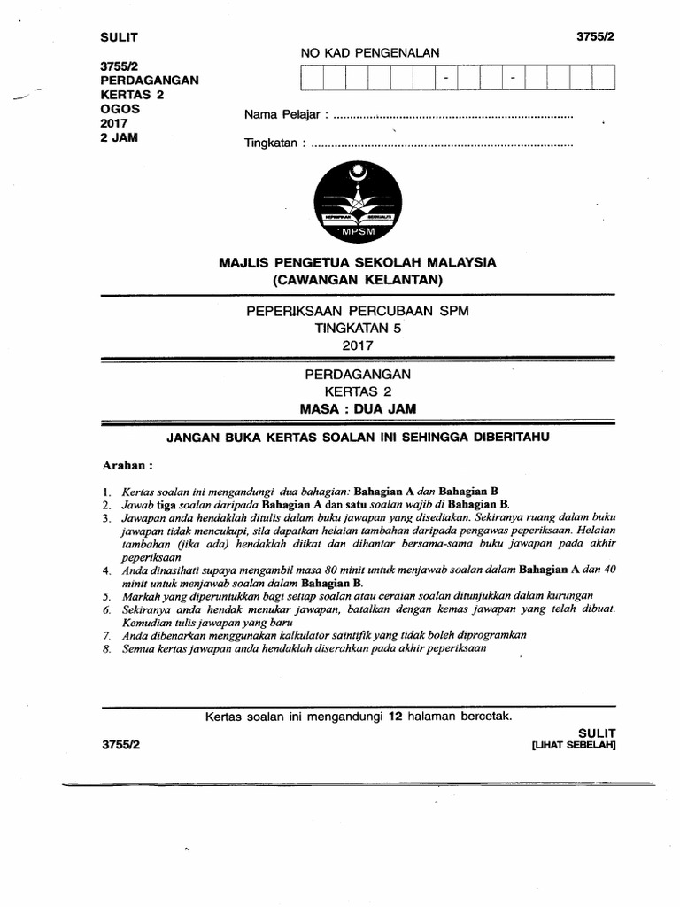 Kertas soalan peperiksaan percubaan perdagangan spm 2017 skema jawapan kertas 1 dan kertas 2.