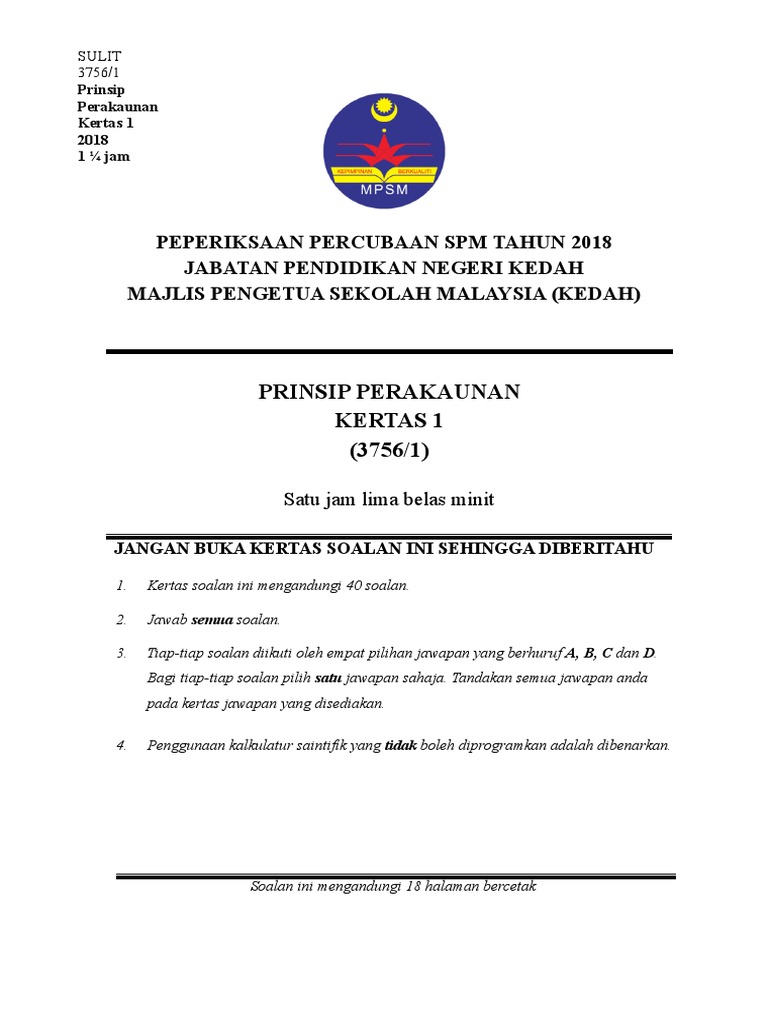 Soalan percubaan spm 2018 prinsip perakaunan. Semoga perkongsian soalan soalan peperiksaan percubaan spm sijil pelajaran malaysia panduan bahan rujukan sumber rujukan dalam post di blog bumi gemilang berguna dan dapat membantu. Kehadiran portal ini juga diharapkan dapat dijadikan platform lati tubi untuk bakal bakal pelajar yang akan menghadapi peperiksaan spm. Pahang negeri sembilan. Antara koleksi kertas soalan yang dikongsikan termasuklah subjek bahasa melayu bahasa inggeris matematik matematik tambahan pendidikan islam sejarah sains prinsip perakaunan dan sains.