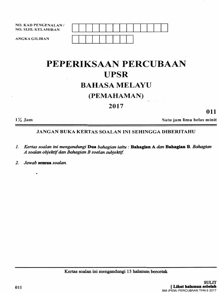 Koleksi Soalan Percubaan Bahasa Melayu Upsr 2017 Pemahaman