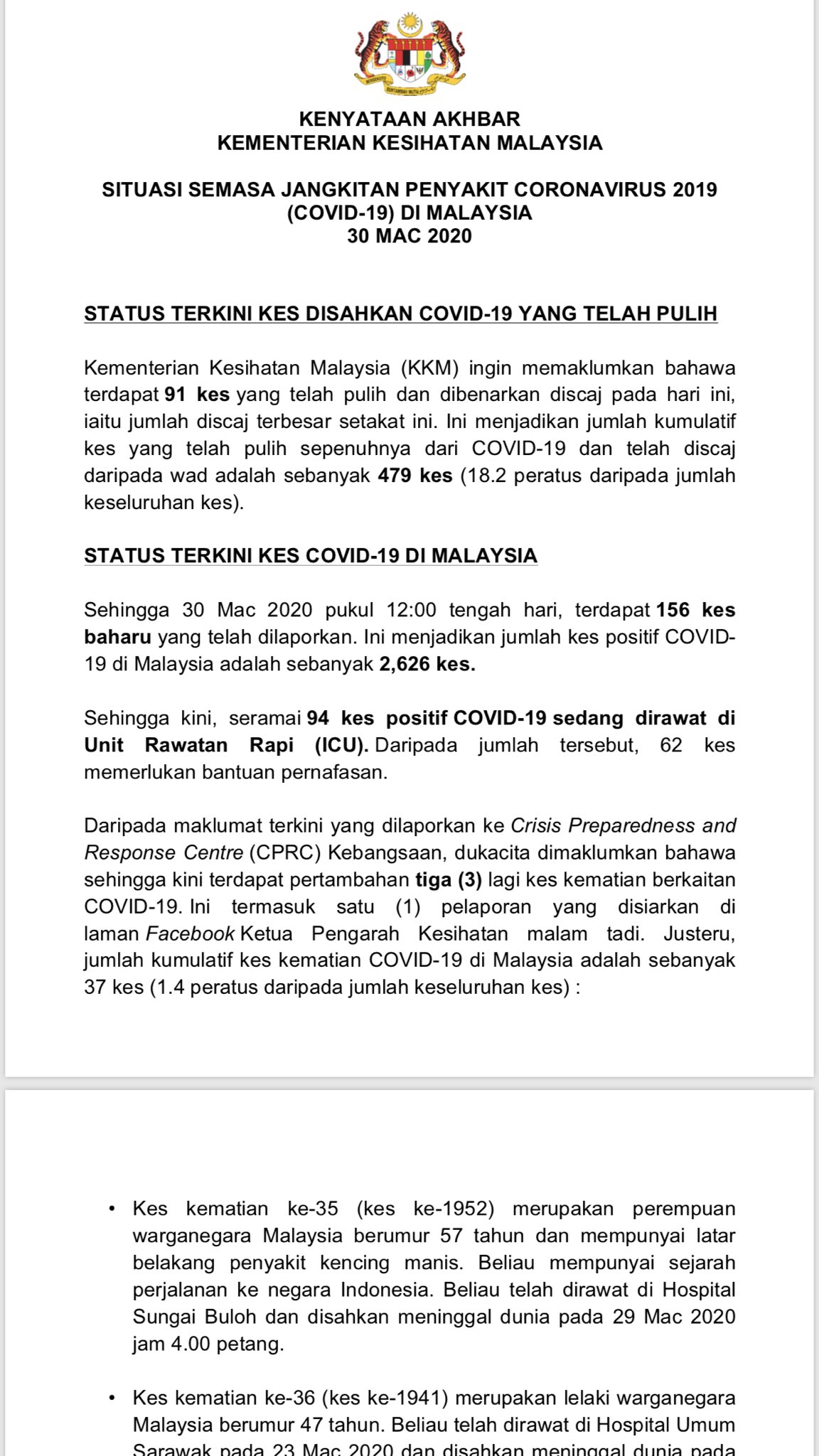 Melissa Goh On Twitter 156 New Covid19 Cases Reported In Malaysia On Monday With 91 Patients Discharged Three Deaths Added Death Toll At 37 Representing 1 4 Of Total 2626 Cases So