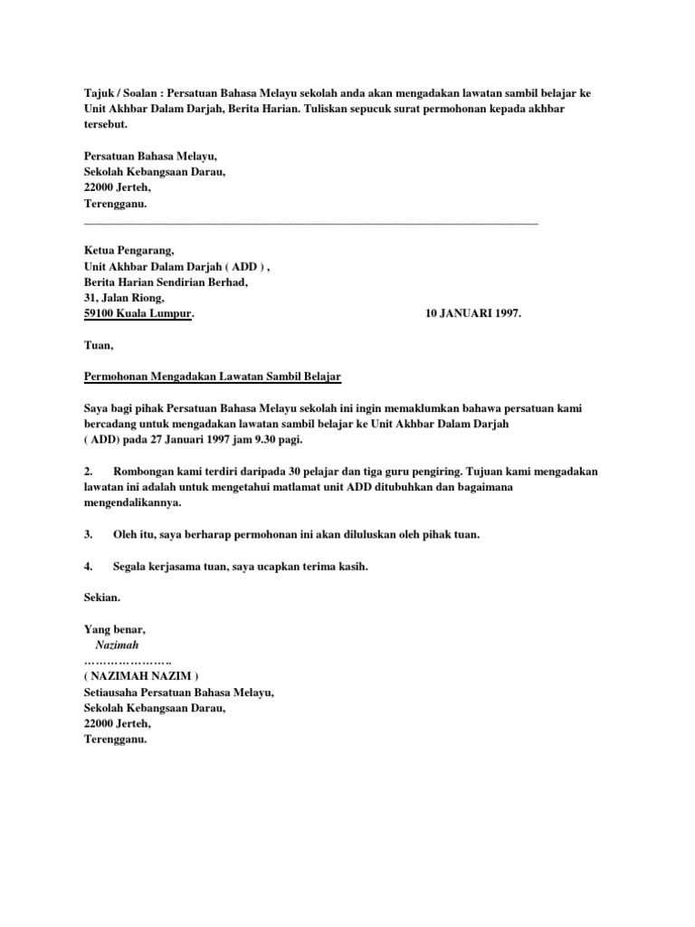 Contoh Surat Rasmi Permohonan Aktiviti Kelab Dan Persatuan Bahasa Melayu