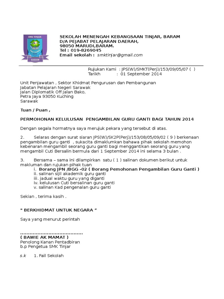 Contoh Surat Rasmi Permohonan Guru Ganti Contoh Surat