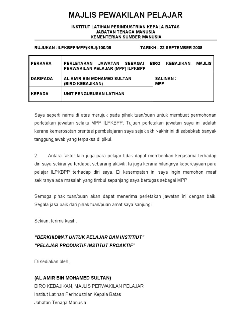 Surat Rasmi Letak Jawatan Kerajaan J Kosong W