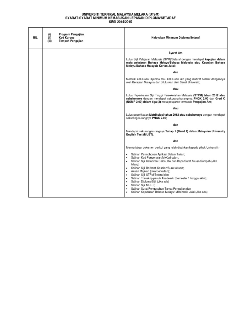 Universiti Teknikal Malaysia Melaka Utem Syarat Syarat Minimum Kemasukan Lepasan Diploma Setaraf Sesi 2014 2015