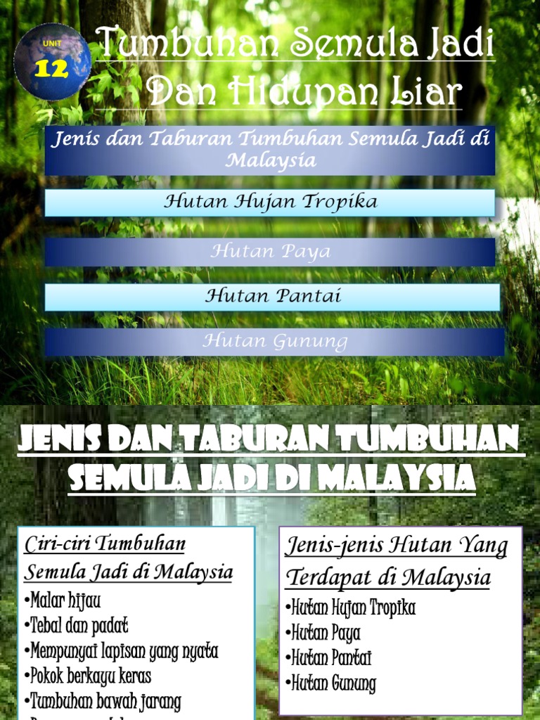 Ianya juga satu warisan alam semulajadi ciptaan allah yang maha esa yang sangat unik dan telah pun wujud lebih dari berjuta juta tahun. Jenis tumbuhan flora jenis tumbuhan di hutan gunung berbeza mengikut ketinggian. Hutan hujan tropika di semenanjung malaysia adalah merupakan salah satu ekosistem yang sangat kompleks di dunia. Hutan hujan tropika hutan hujan tropika merupakan hutan yang paling luas di malaysia.