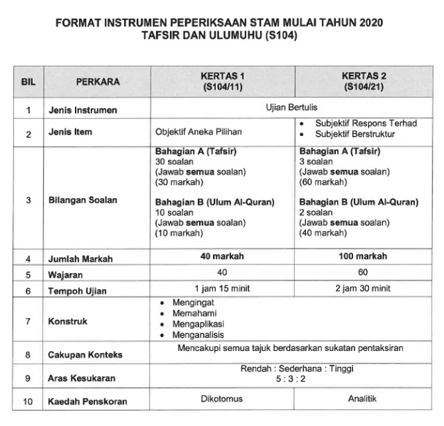 Format Baharu Instrumen Peperiksaan Stam 2020