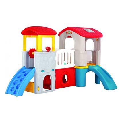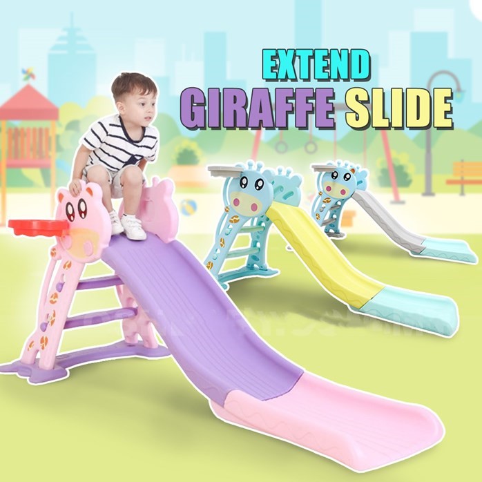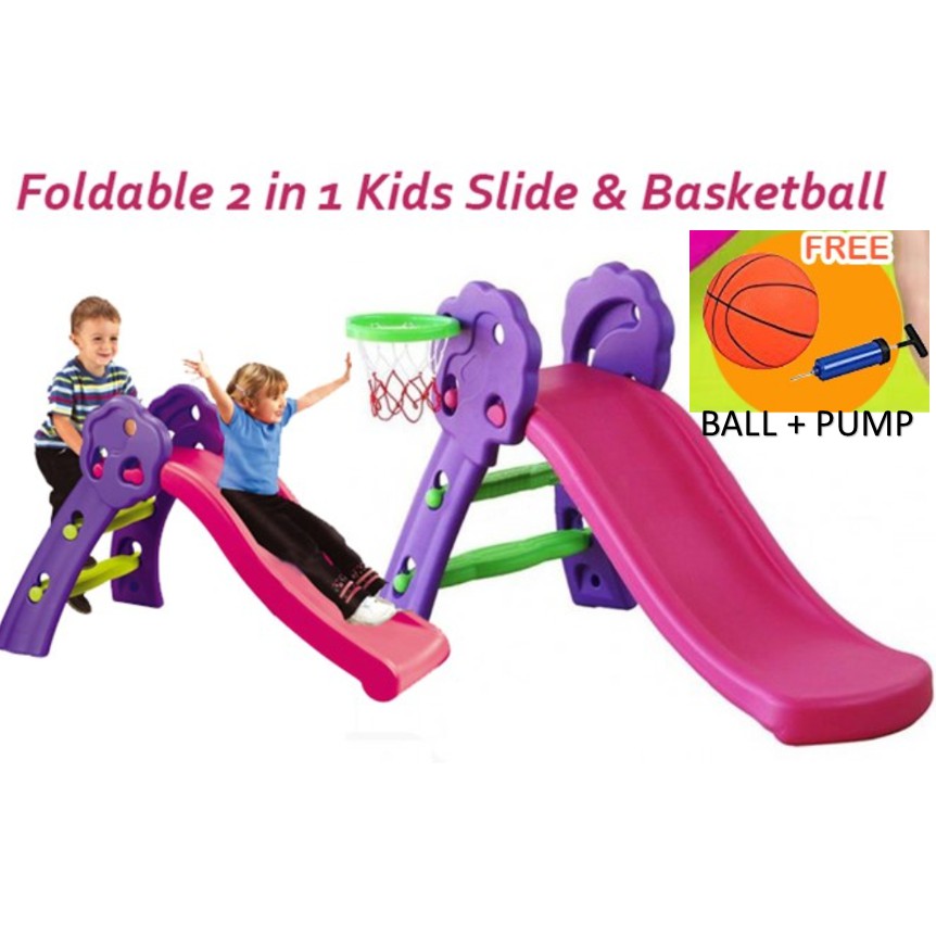 Taman permainan mini ini mempunyai fungsi 3 dalam 1 kerana ia dilengkapi dengan buaian gelongsor dan jaring bola keranjang.