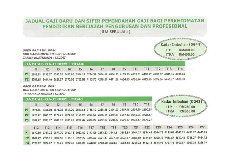 Jadual gred dg44 p1 kenaikan gaji tahunan rm250 00 selepas maksimum campur kadar tetap 3 gaji maksimum warna kuning dg44. Contoh penetapan gaji permulaan kenaikan pangkat kenaikan gred dg44. Rm 5583 kgt dg48 rm 270 rm 5853. Gaji pokok akan ditambah dengan elaun elaun dalamperkhidmatan seperti yang ditunjukkan di bawah.