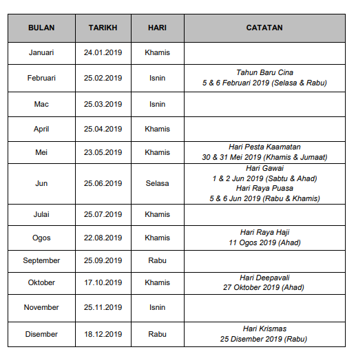 Tarikh Pembayaran Gaji Bulanan Bagi Tahun 2019 Dpuncak Homestay Bukit Katil Melaka
