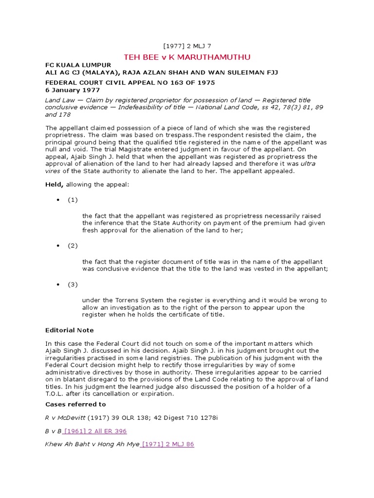 Teh Bee V K Maruthamuthu 1977 2 Mlj 7 Land Law I Studocu