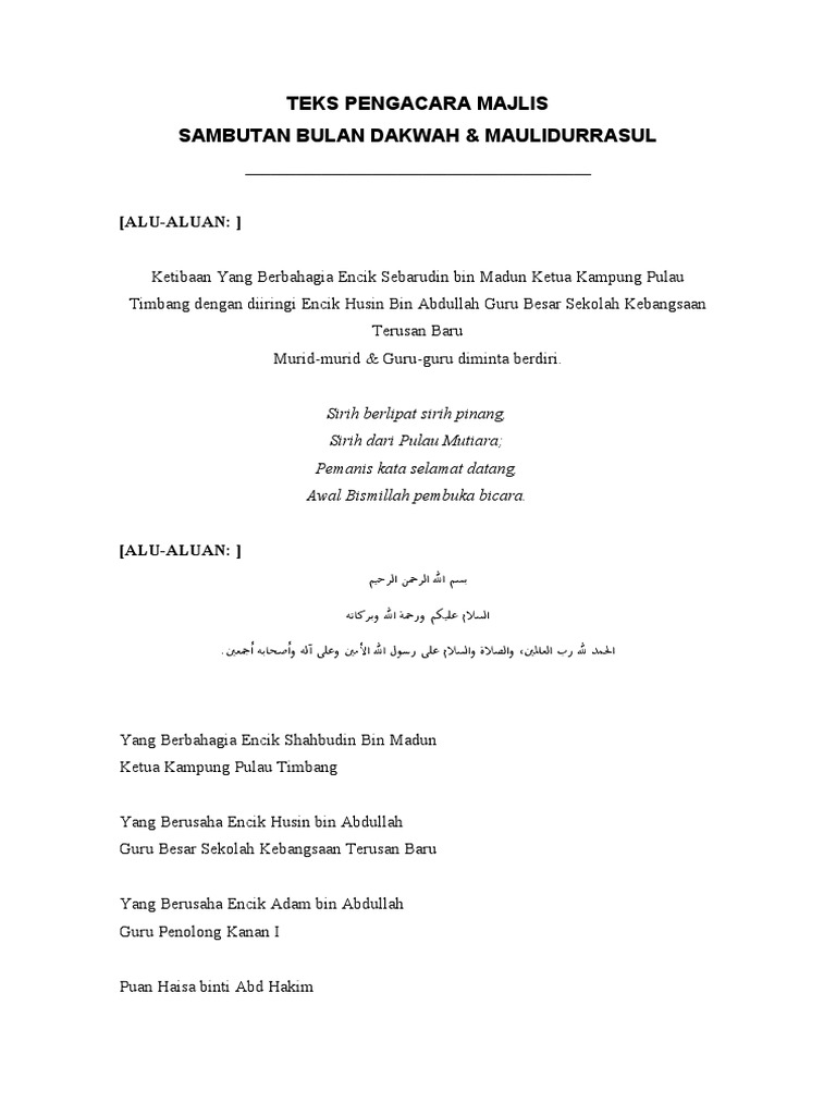 Teks Pengacara Majlis Sambutan Maulidur Rasul Docx Document