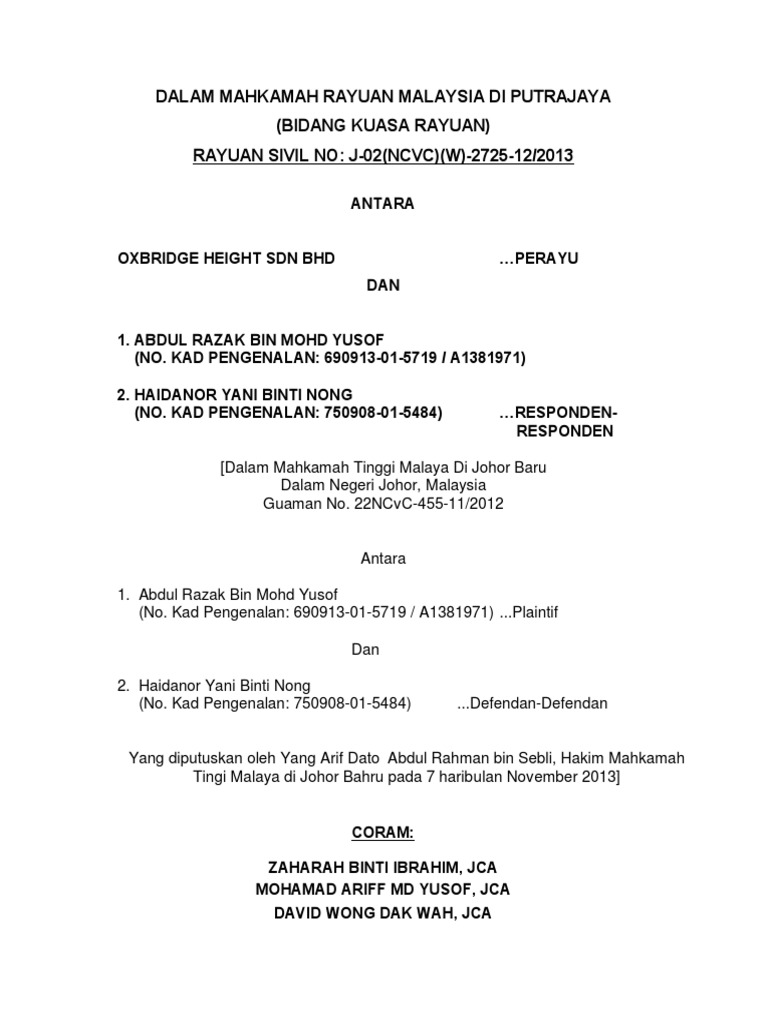 Association of maybank class one officers 2000 6 mlj 625. The primary objective of the establishment of the tribunal is to provide an alternative channel for consumers to file a claim for redress in a convenient inexpensive and speedy manner. Tribunal tuntutan pembeli rumah negeri pulau pinang 2017 mlju 216 hartaplus realty sdn. In pjd regency the appellant a housing developer sought to quash the award of damages by the 1st respondent the homebuyer s tribunal tribunal for the appellants delay in the delivery of vacant possession of the property and common property.