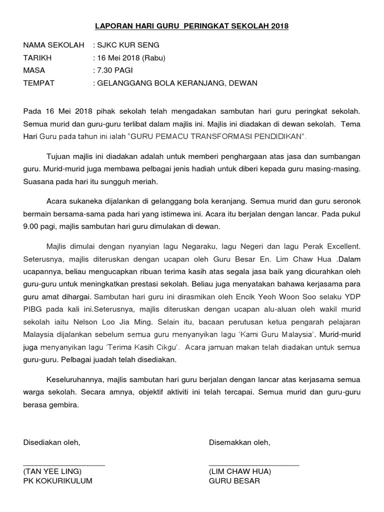 Kebiasaannya program ini diadakan pada waktu pagi dan dihadiri oleh semua pelajar dan wakil pibg. Dalam meraikan sambutan hari guru banyak program yang boleh dilaksanakan sekolah. Oleh itu pihak kementerian pelajaran malaysia telah menetapkan 16 mei sebagai hari guru dan mengadakan sambutan hari guru di setiap sekolah di negara kita. Di sini admin ingin berkongsi himpunan laporan sambutan hari kemerdekaan hasil daripada perkongsian dari rakan guru bagi sambutan bulan kemerdekaan yang tiba tidak lama lagi.