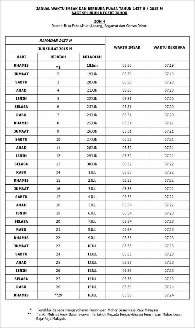 Johor 2020 jadual waktu berbuka puasa dan imsak. Takwim atau jadual waktu berbuka puasa dan imsak ramadhan 1441h 2020m negeri johor sepertimana dikeluarkan oleh jabatan kemajuan islam malaysia jakim. Lampiran takwim atau jadual waktu buka puasa imsak dan sahur di bulan ramadhan pada 2020 masihi bersamaan 1441 hijrah bagi seluruh kawasan di negeri johor. Daerah batu pahat muar tangkak segamat dan gemas johor.