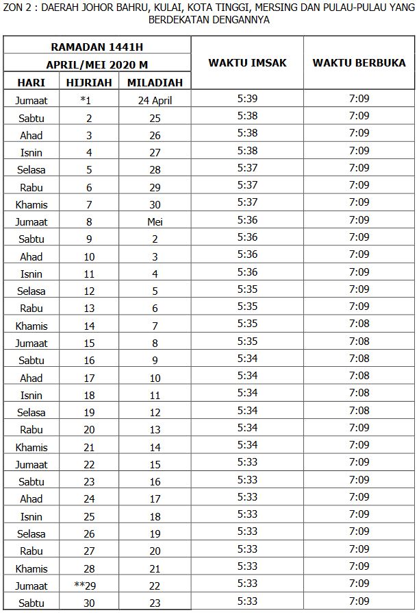Daerah johor bahru kulai kota tinggi mersing dan pulau pulau yang berdekatan dengannya ramadan 1441h april mei 2020 m waktu imsak waktu berbuka hari hijriah miladiah jumaat 1 24 april 5 39 7 09 sabtu 2 25 5 38 7 09 ahad 3 26 5 38 7 09. Jadual rasmi berbuka puasa telah dikeluarkan oleh jabatan kemajuan islam malaysia jakim dan memaparkan maklumat hari tarikh hijrah dan miladiah untuk waktu berbuka puasa dan imsak. Waktu solat kota tinggi mersing dan johor bahru 2020 imsak. Waktu solat islam yang paling tepat di johor bahru johor malaysia waktu fajar hari ini 05 43 am waktu zohor 01 04 pm waktu asar 04 13 pm waktu maghrib 07 08 pm waktu isyak 08 17 pm.