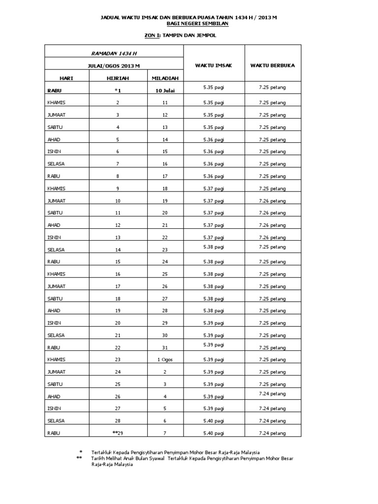 Jadual waktu imsak dan berbuka puasa tahun 1441 h 2020 m bagi seluruh negeri sembilan zon 2 seremban p dickson k pilah rembau dan jelebu radan 1441h waktu imsak waktu berbuka april mei 2020 m hari hijriah miladiah jumaat 1 24 april 5 45 7 17 sabtu 2 25 5 44 7 17 ahad 3 26 5. Seremban port dickson kuala pilah rembau dan jelebu ramadan 1440h mei jun 2019m waktu imsak waktu berbuka hari hijriah miladiah isnin 1 6 mei 5 33 pagi 7 16 malam selasa 2 7 5 33 7 16 rabu 3 8 5 33 7 16. Jelebu jempol kuala pilah port dickson rembau seremban tampin. Jadual waktu imsak dan berbuka puasa tahun 1440h 2019m bagi seluruh negeri negeri sembilan zon 2.