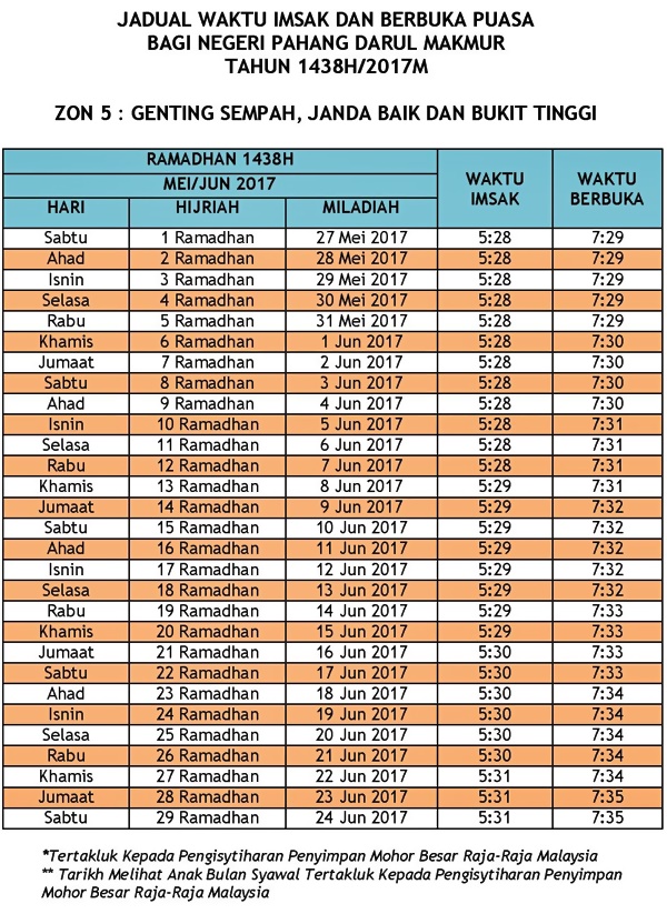 Berikut adalah lampiran takwim atau jadual berbuka puasa dan waktu imsak pada bulan ramadhan tahun 1439h 2018m bagi seluruh negeri pahang.