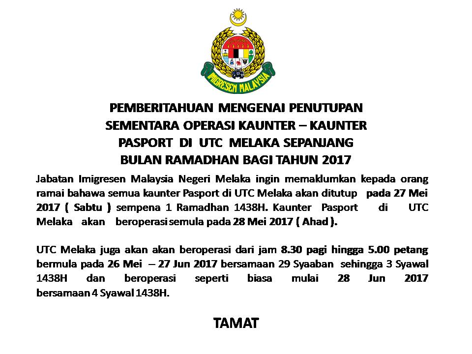Imigresenmelaka On Twitter Makluman Mengenai Penutupan Sementara Dan Perubahan Waktu Operasi Kaunter Pasport Utc Melaka Sempena Ramadhan 1438h Kp Jim Imigresenmy Https T Co 6valcoqqv1