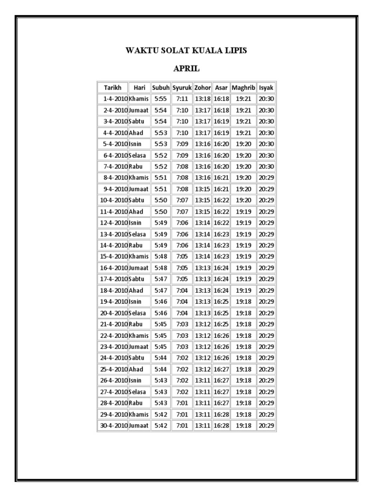 Waktu Solat Kuala Lipis April 2011