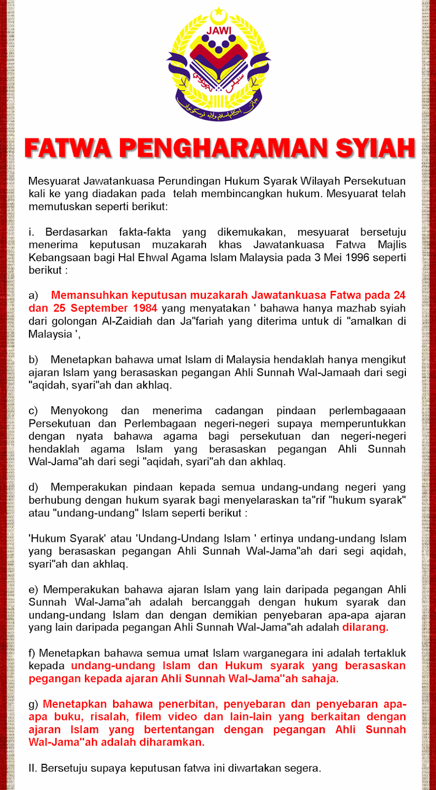 Fatwa Pengharaman Syiah Di Wilayah Persekutuan Kuala Lumpur Putrajaya Dan Labuan